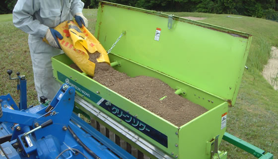 また、芝生への施肥方法は芝生面への表面散布が一般的です。これは撒布された肥料が降雨、散水によって溶け出し、土壌中に浸透することで芝生の根に吸収されるためです。しかし、ケイフン、牛糞堆肥、コンポストなどの形状のものは、表面に層として残り、また悪臭や衣服などへの付着の問題からあまり用いられません。校庭や競技場など固結の激しいところは、このような有機質の肥料資材の施用がとくに必要とされているにも関わらず、それが前述のような理由から行われず、生育に必要な成分が欠乏しがちで、いわゆる地力(土壌の肥料供給能)がなくなり、固結もすすみ、次第に芝生の成長や回復力が衰えてしまっておりました。